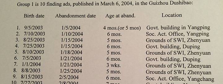 One day in 2008 I was discussing international adoption with a Chinese friend who didn't know much about it. I mentioned the term “finding ad.” These announcements are published in local Chinese newspapers, and sometimes include photos of “found” babies and are ostensibly a way of giving birth parents an opportunity to come forward and reclaim children who will be placed for adoption. Other people feel finding ads are merely a formality to transfer custody of a child to the SWI, in preparation for the child to be internationally adopted. I showed my friend my daughter's ad, which also included nine other children. I had received a copy of the newspaper finding ad from the guide who helped us and the other adoptive families when we adopted three years earlier in 2005, but only my daughter's ad was translated into English. I never knew what the other nine ads said and I never thought to get them translated. There was only one sentence written about each child. I remember my friend standing in my kitchen, reading the ten little ads over and over and over again as I thought to myself, “Why is she taking so long to read ten little ads?” Finally she asked me if I knew what these other nine ads said.